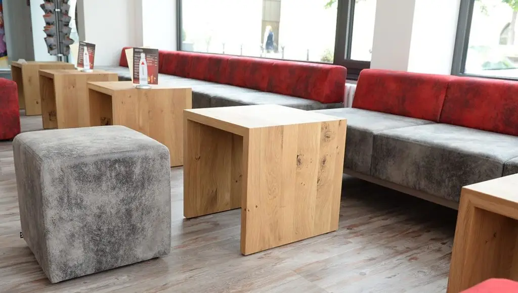 Vollpolsterbank Fredi Gestell: Bänke wahlweise mit Stollengestell massiv Buche oder Eiche 4 x 4 cm oder Banksockel Eiche oder Buche furniert