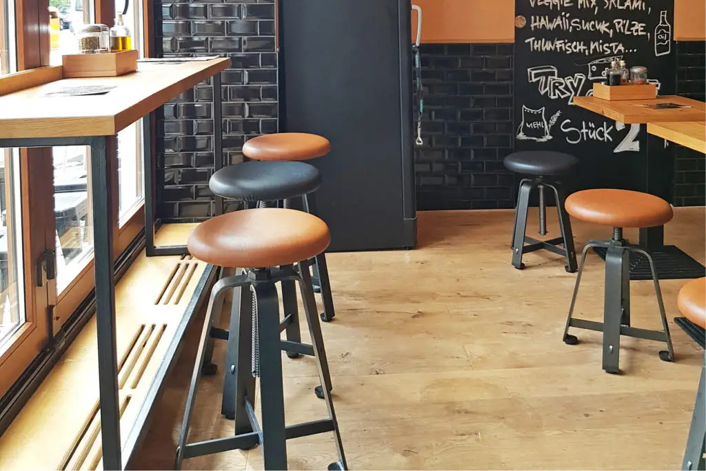 Mit seinem komfortablen Polstersitz wird der rustikale Drehhocker schnell zum neuen Lieblingsplatz in der Bäckerei, in der Systemgastronomie oder in der Bar. Er ist ein wahrer Alleskönner, der sich wunderbar mit anderen Stilrichtungen kombinieren lassen.