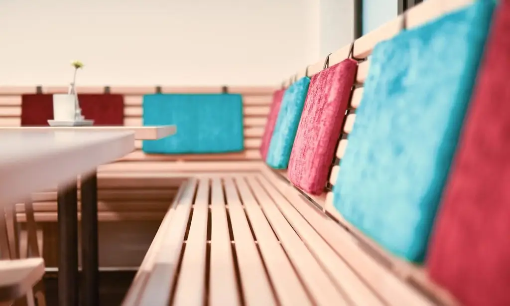 Die leicht geschwungene Rückenlehne aus angenehm abgerundeten Holzlatten liefern wir in massiver Buche oder Eiche. Mit einer Breite von 5 und einer Stärke von 2,5 Zentimetern halten die Latten auch erhöhter Belastung etwa bei jugendlich unruhigen Gästen problemlos stand. Sie können die Bänke in Nischen platzieren, frei im Raum aufstellen oder Rücken an Rücken als Raumteiler nutzen. Immer haben Sie durch die leicht transparenten Lattenrücklehnen eine andere, interessante Raumwirkung. Die geschwungene Form der Lehne und das warme Material Holz sorgen bei aller Klarheit der Linien für eine heimelige, gemütliche Atmosphäre.