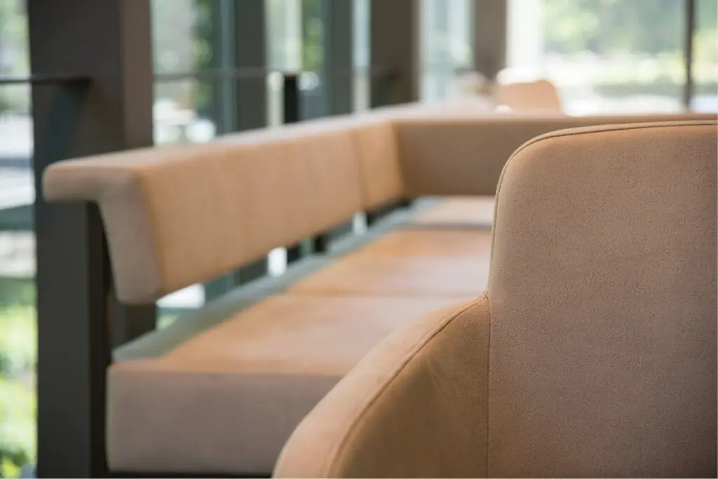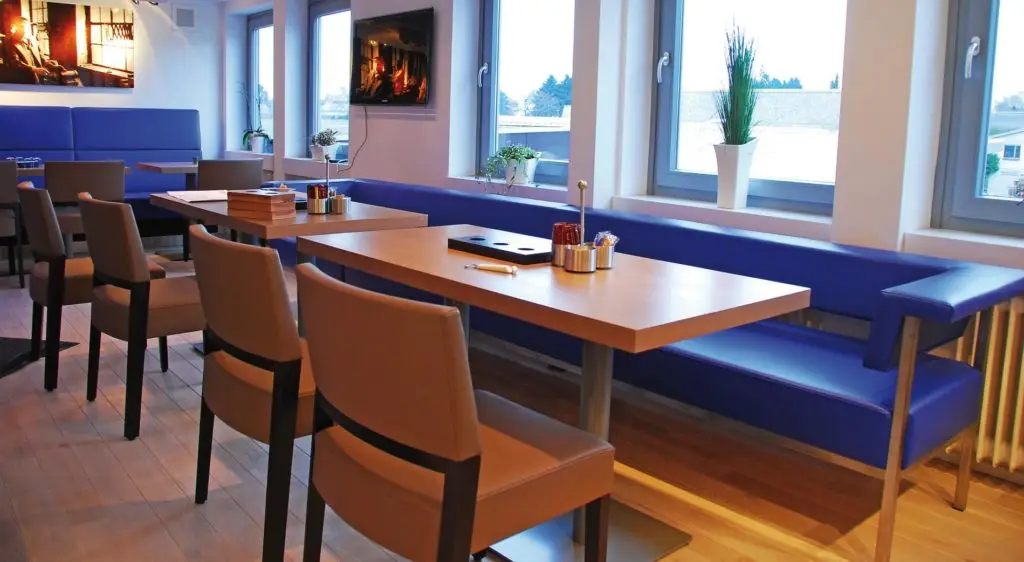 Die Sitzbank Thilo 40882 ist ein moderner Blickfang, ganz gleich wo sie eingesetzt wird. Mit einer geraden Rückenlehne und besonders bequemer aber fester Polsterung macht sie im Wartebereich eine ebenso gute Figur wie in der Systemgastronomie.