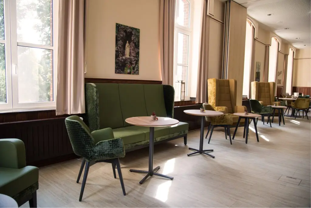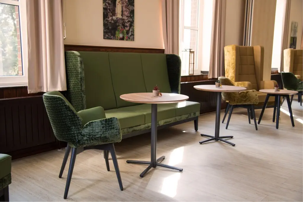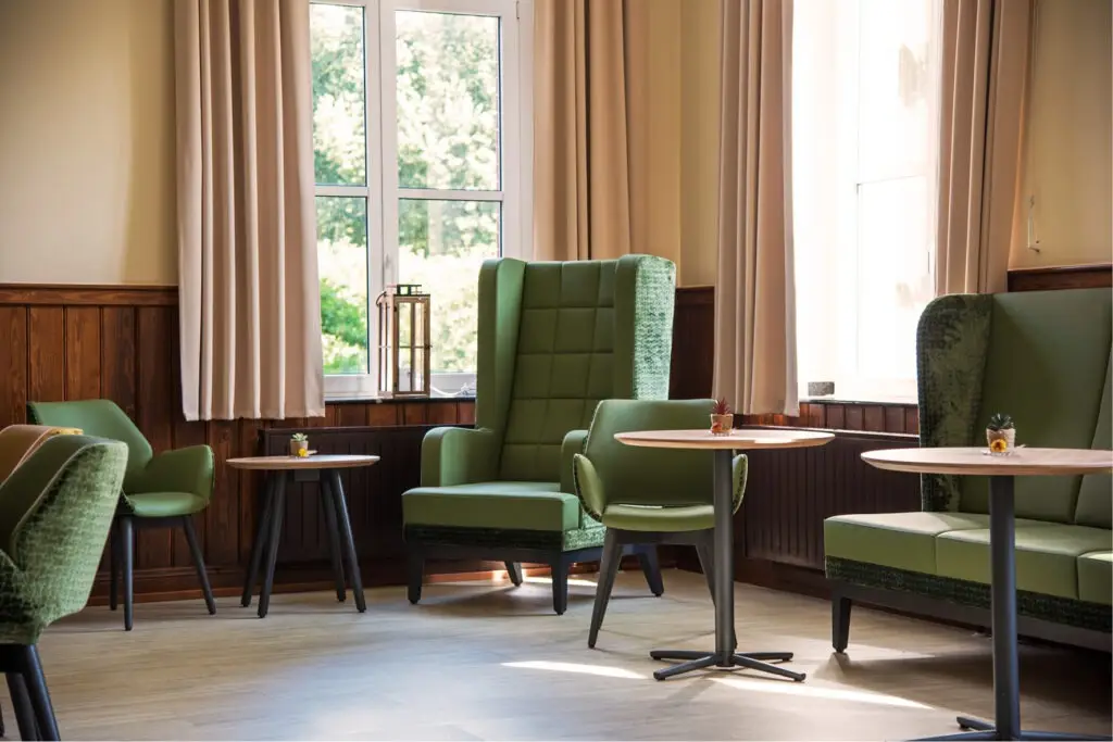 Große Ohrensofas und -sessel schaffen nicht nur eine gemütliche, sondern auch eine intime Atmosphäre. Selbst verständlich befindet sich die Höhe der Sessel und Sofas in normaler Stuhlhöhe, damit man nicht nur entspannt, sondern auch kultiviert mit Messer und Gabel essen kann. Ohrensessel schaffen zudem durch ihre „Ohren“ eine akustische Abkopplung vom Geschehen rundum und somit eine intime, ungestörte Atmosphäre.