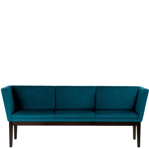Die Sitzbank Timo 40925 zeigt sich außerordentlich elegant mit einem leicht nach außen geneigten Rücken sowie ebensolchen Seitenteilen. Dabei unterstreicht die Unterkonstruktion mit den nach unten konisch zulaufenden Stollen die Leichtigkeit des Designs. Wie alle Möbel von Schnieder, ist auch dieses Sofa handwerklich mit einem massiv verzargten Rahmen gefertigt. Zu haben als Einsitzer in der Breite 78 cm, Zweisitzer in der Breite 138 cm oder als Dreisitzer in der Breite 198 cm, macht die Polsterbank mit einer Sitzhöhe von 46 cm sowohl in Wartebereichen, im Restaurant, in der Lounge und auf dem Hotelzimmer eine gute Figur. Durch zusätzliche Kissen, die die Stuhlfabrik Schnieder auf Kundenwunsch ebenfalls anfertigt, entsteht ein sehr behaglicher Charakter.