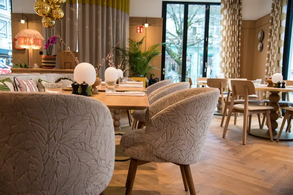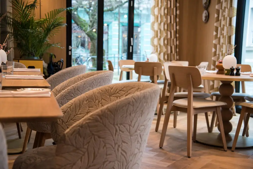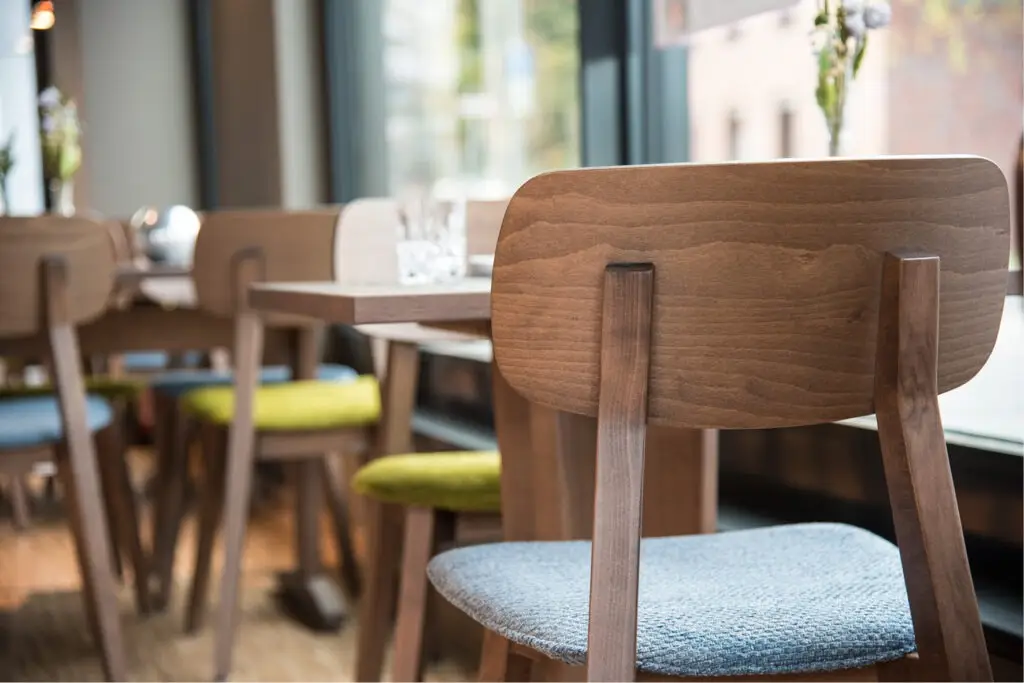 Die leicht nach außen gestellten Stuhlbeine und die harmonische Verbindung von Sitzpolster und Gestell verleihen dem Gastronomie Stuhl Torge eine ästhetische Ausstrahlung. Stilvolle Farbtöne des Stoffbezugs passen sich dem natürlichen Look des Gestells an und unterstreichen seine Eleganz.