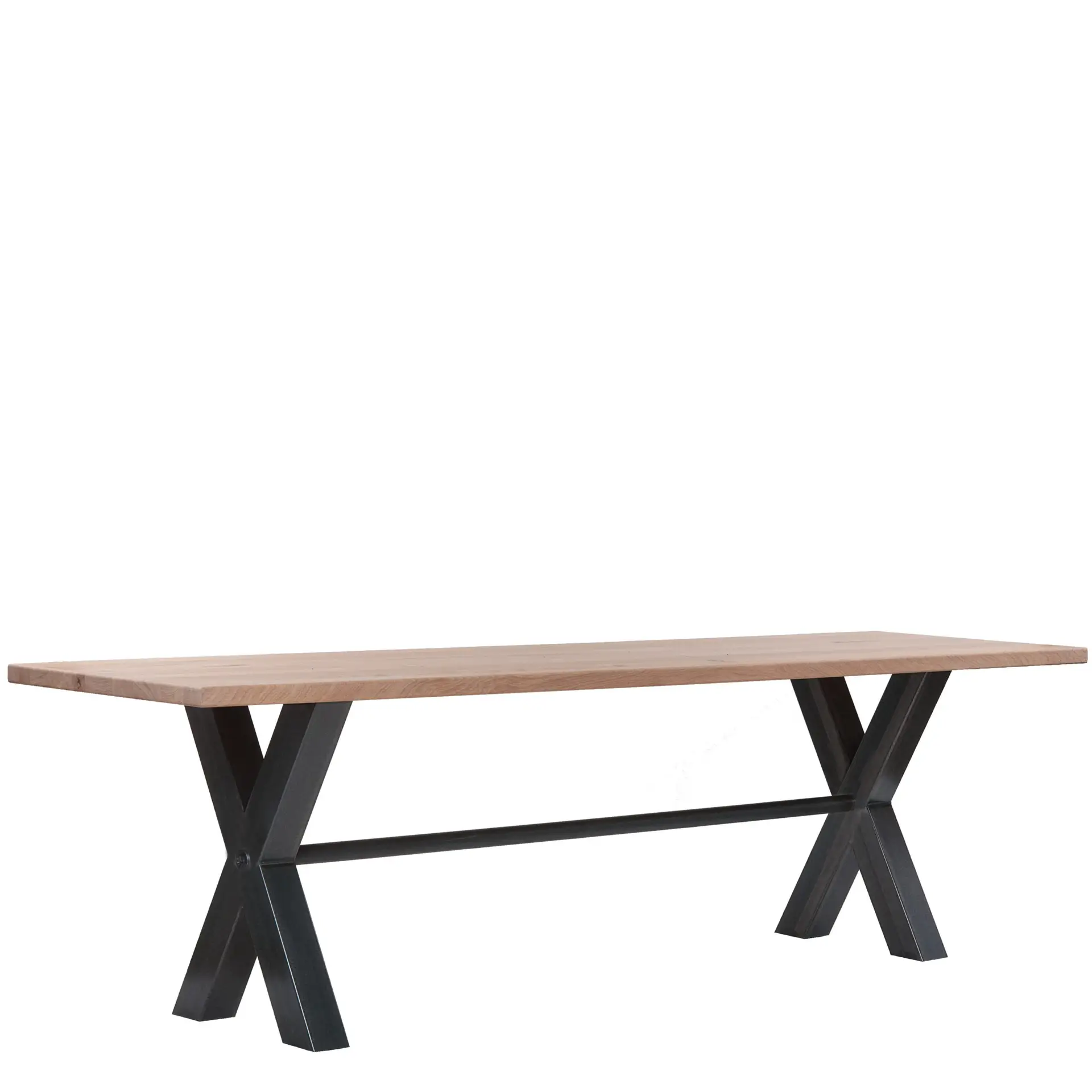 Dieser Materialmix begeistert Freunde der rustikalen Einrichtung. Massiv gekreuzte 80 x 80 mm dicke Vierkantrohre, verbunden durch ein 40 mm dickes Rundrohr stützen den imposanten Esstisch 30590. Die grob verschweißten Nähte und deutlichen Gebrauchsspuren in der stumpfmatt in Schwarzstahl pulverbeschichteten Oberfläche der Stützen, sorgen für einen schroffen Stil. So fügt sich der Tisch in verschiedene Ambiente hervorragend ein. Im Loftstyle eingerichtete Dinnerräume profitieren ebenso von dem großflächigen Tisch wie Restaurants im Industrielook.