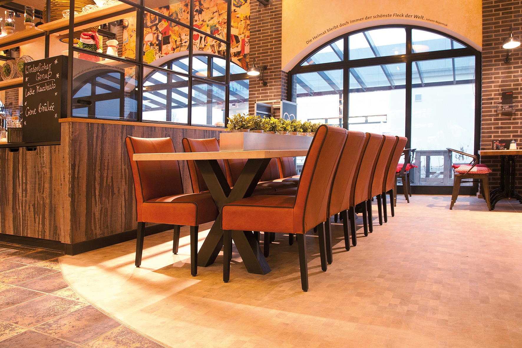Der rustikale und imposante Gastronomie Tisch lässt sich besonders gut mit Interieur aus grob bearbeiteten Hölzern und Stahl kombinieren. Aber auch ein Einsatz als Blickfang zwischen moderner Einrichtung oder Tafel für thematische Buffets und Abende ist möglich. Bäckereien und Cafés wissen den Gastronomie Tisch wegen seiner schieren Größe zu schätzen. Im Einsatz mit Sitzbänken eignet sich der Tisch auch zur Platzierung von Familien hervorragend. Mit einer Plattenhöhe von 74 Zentimetern kann er mit Essstühlen und Bänken genutzt werden.