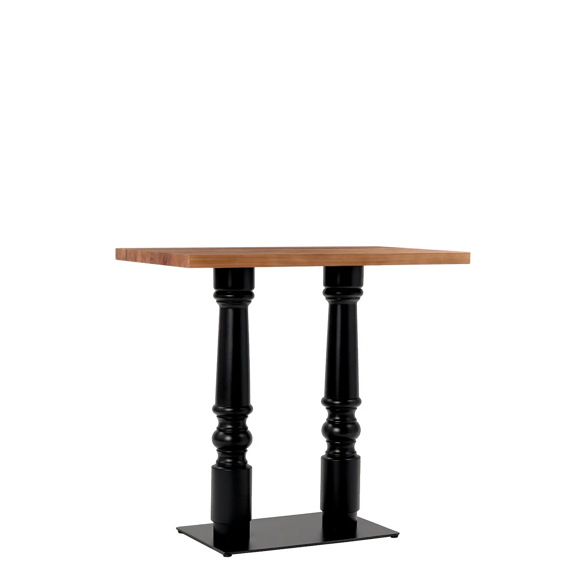 Stehtisch Rosa 31273 – die Grundkonstruktion ist ein aus Vollmetall und Holz gefertigtes Tischgestell mit gedrechselten Massivholzsäulen und aufgelegter Tischplatte. Die Gestellkonstruktion besteht aus einer rechteckigen Stahlbodenplatte/Edelstahl. Die Bodenplatte ist mit zwei 60 mm hohen Rundrohrstutzen zur Aufnahme der Holzsäulen versehen. Die Holzsäulen des Stehtisch Rosa 31273 sind mittig hohl und zur Aufnahme der Verbindungsstange vorbereitet.