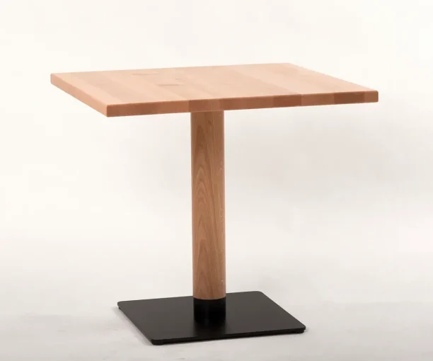 Die Holzsäule besteht aus Buche Massivholz und hat einen Durchmesser von 100 mm. Die Säule hat am oberen Ende eine 35 mm Multiplexplatte als Auflage für die Tischplatte. Holzsäule, Stutzen, Multiplexplatte und Bodenplatte sind mit einer innenliegenden Gewindestange und Schlossschrauben kraftschlüssig miteinander verbunden. Die Tischplatte wird mit der Aufnahmeplatte des Gestells verschraubt. Die Edelstahlflächen sind matt geschliffen und gebürstet. Die Bodenplatte ist mit vier runden Verstellgleitern aus Kunststoff oder Aufschlagkappen aus Kunststoff versehen.