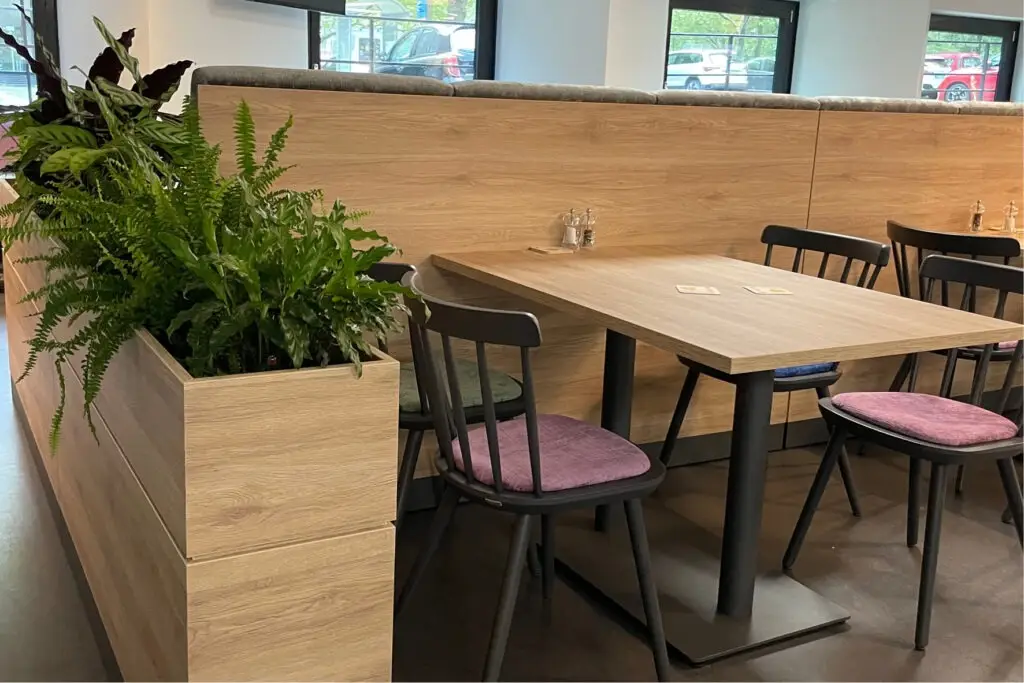 Mit dem Raumteiler Knut 50205 gestalten Sie elegante und funktionale Raumkonzepte für Gastronomiebereiche. Ob in Cafés, Hotels, Restaurants, Kantinen oder Mitarbeiterrestaurants – der Raumtrenner bietet eine flexible Lösung zur Schaffung von Nischen, die Privatsphäre und Gemütlichkeit für Ihre Gäste schaffen. Durch die Trennung von Laufwegen und Eingängen sorgt der Raumteiler zudem für mehr Ordnung und Sichtschutz in Ihren Räumlichkeiten.