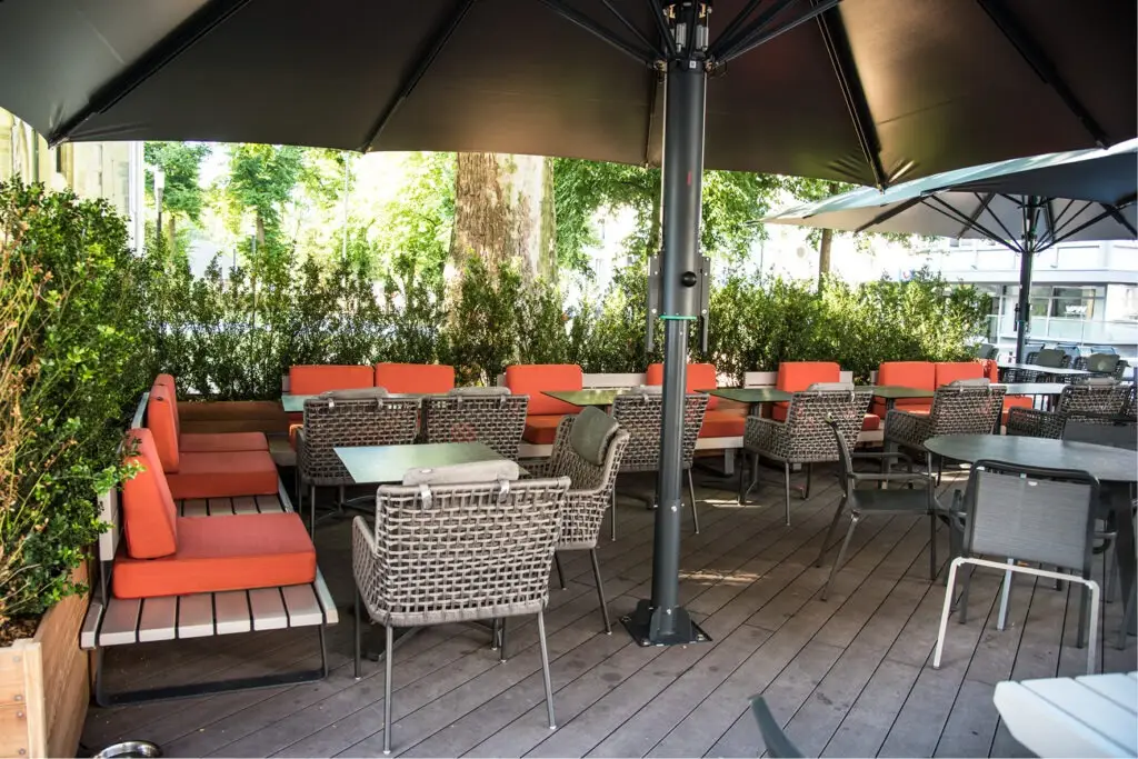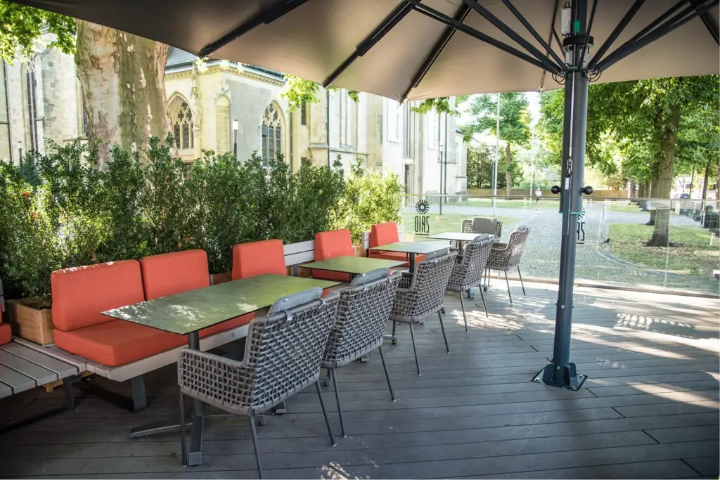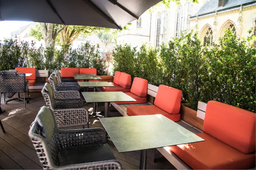Direkt auf dem Kirchplatz der wunderschönen St. Felizitas Kirche bietet das Restaurant Zaid eine großzügige Außengastronomie, auf der die Gäste im Schatten der Bäume genießen und verweilen können. Unsere Terrassenmöbel aus der Serie Osis wurden hier mit den Möbeln der Firma Stern geschmackvoll kombiniert. Planung: Innenarchitektur Martina Pietschmann Stern Outstanding Terrassenmöbel
