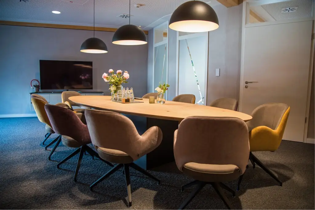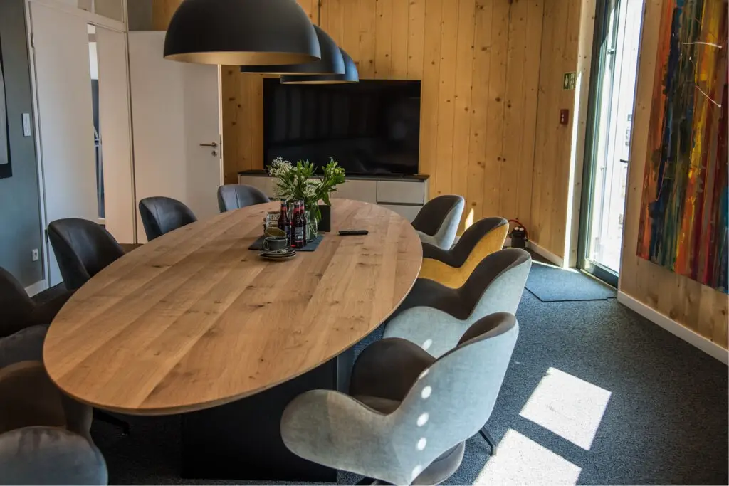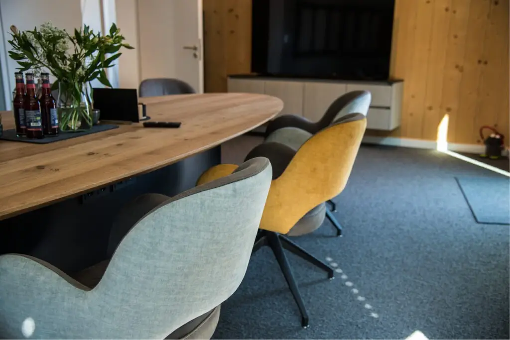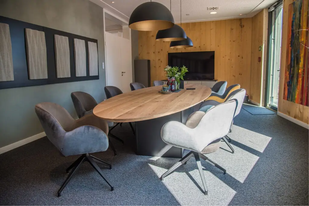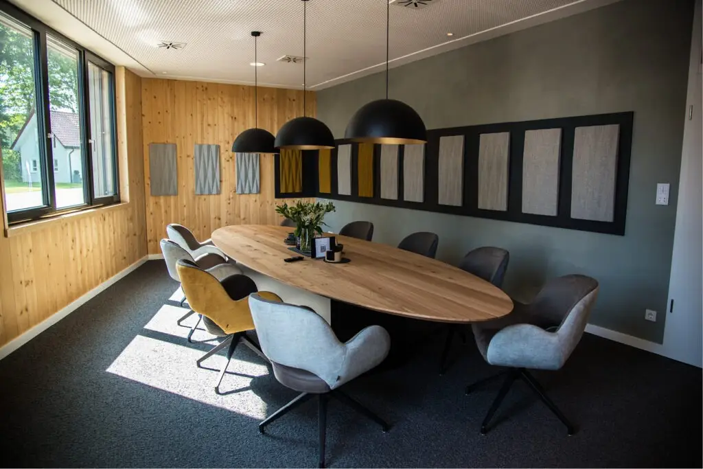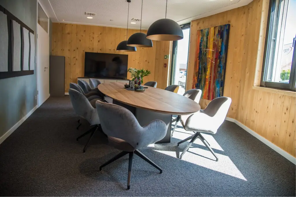 Die Gestaltung von Besprechungsräumen ist eine anspruchsvolle Aufgabe, die sowohl die Bedürfnisse der Mitarbeitenden als auch die strategischen Ziele der Geschäftsführung berücksichtigen muss. Für die Mitarbeitenden stehen Aspekte wie Komfort, eine angenehme Atmosphäre und eine optimale Akustik im Vordergrund, um konzentriert und effektiv arbeiten zu können. Die Geschäftsführung hingegen legt Wert auf Repräsentativität, Funktionalität und die Förderung effizienter Kommunikation und Entscheidungsprozesse. Beide Räume bei Westfalia Spielgeräte erfüllen diese Anforderungen in Perfektion.