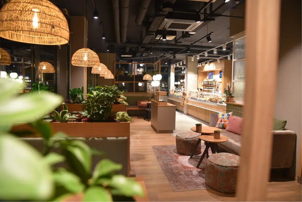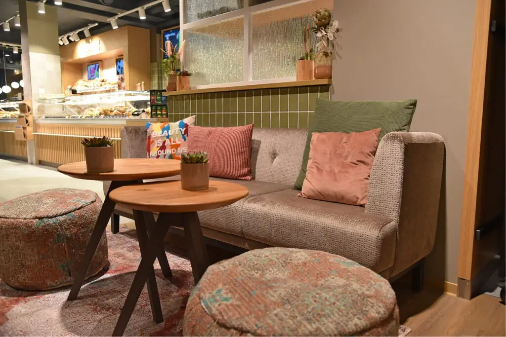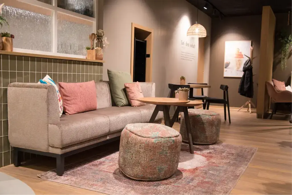 Entlang der Fensterfront sorgt die Bank Tobi inklusive Wandpolster für ein Ambiente, das an ein stilvolles Diner erinnert. Das Dining Sofa Max in Kombination mit Lounge-Tischen, Sitzkissen und einem Teppich verleiht dem Sitzbereich einen behaglichen Wohnzimmer-Charakter. Hier können Gäste entspannt ihren Kaffee genießen und sich wie zu Hause fühlen.
