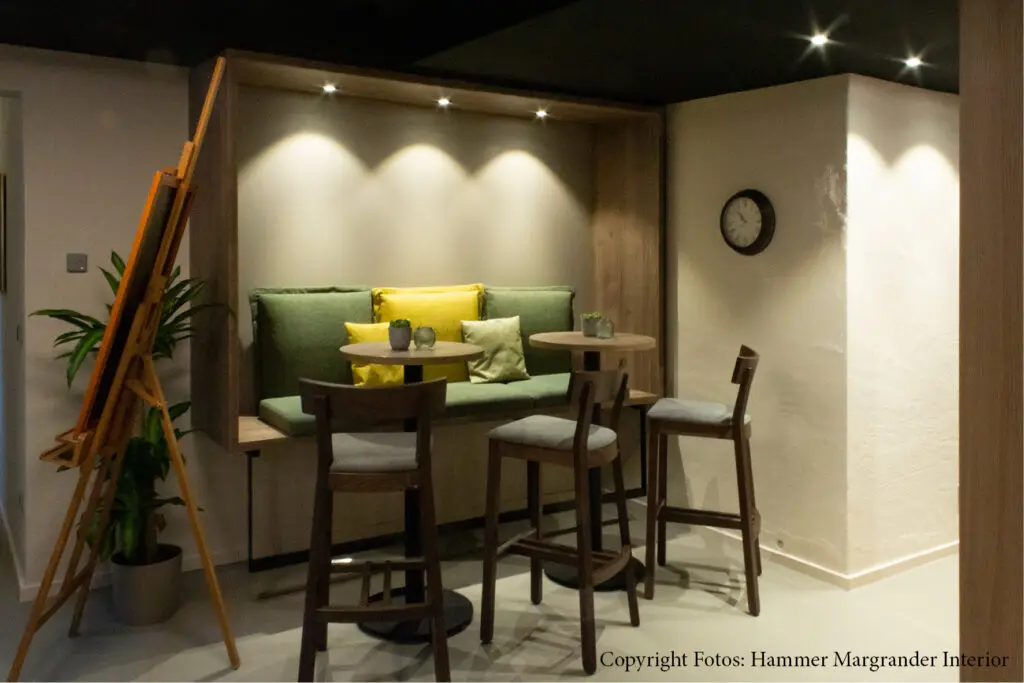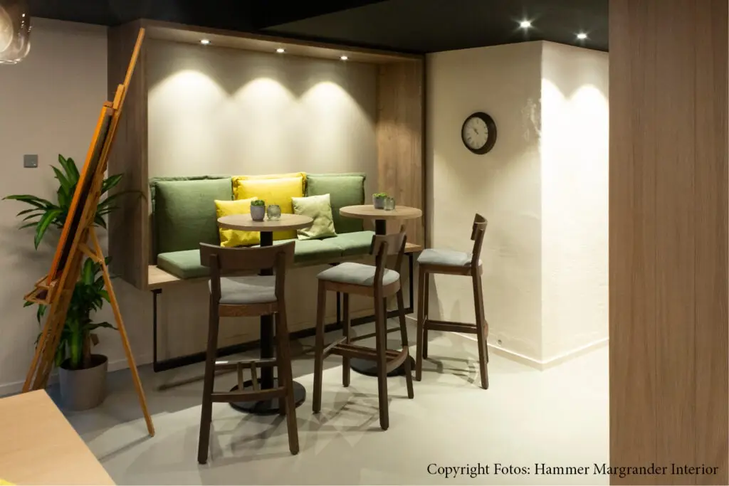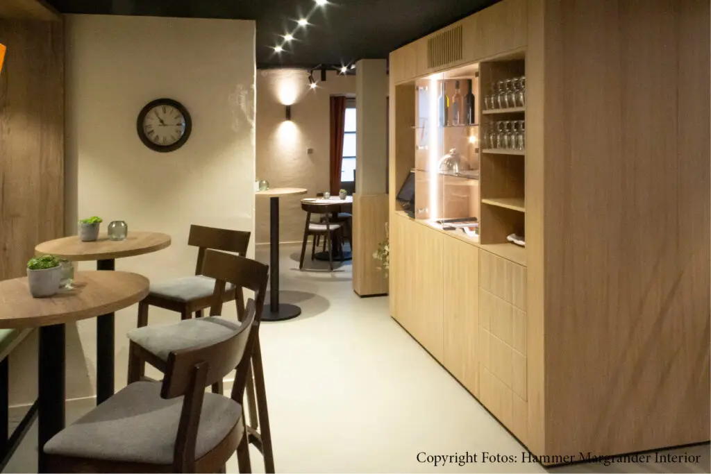 Einrichtung Brasserie klein, aber fein mit jeder Menge Flair. In dieser gemütlichen Brasserie verschmilzt stilvolles Design mit individuellem Charme. Warme Farbnuancen umschmeicheln den Raum, während maßgeschneiderte Sitzbänke und der einzigartige Gastro-Stuhl Mats eine einladende Atmosphäre schaffen. Der Stuhl Mats ist das perfekte Beispiel für anspruchsvolle Gastfreundschaft, seine hochwertige Verarbeitung und modernen Elemente machen ihn zum Highlight jeder gastronomischen Einrichtung. Ein kleiner Raum, aber mit einem Flair, das Großes ausstrahlt. Planung: Hammer Margrander Interior GmbH Copyright Fotos: Hammer Margrander Interior GmbH   Weitere Gastro-Stühle finden Sie in unserer Übersicht