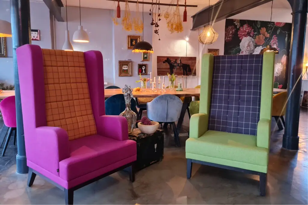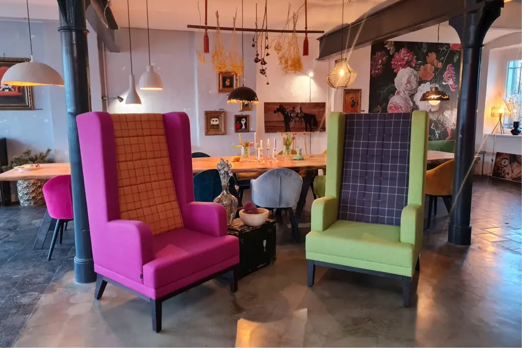 Im Atelier für Interior Kunst und Genuss von Janet Selent erleben Gäste eine faszinierende Farbkomposition in einem vielseitig nutzbaren Raum. Die Auswahl zwischen den regenbogenfarbigen Sesseln Tina und dem traumhaften Ohrensessel Pia begeistert. Pia, ein wahrer Gemütlichkeits-Champion, lädt förmlich zum ausgiebigen Chillen und Müßiggang ein. Mit seinem einladenden Design und behaglichen Sitzkomfort wird der Ohrensessel zum perfekten Begleiter für entspannte Stunden, ein wahrer Ort für Genuss und schöne Gespräche. Fotos von: Atelier Janet Selent  Alles rund um die schönen und kleinen Dinge im Leben entsteht in diesen Räumen. Dekoart & Styling, Janet Selent