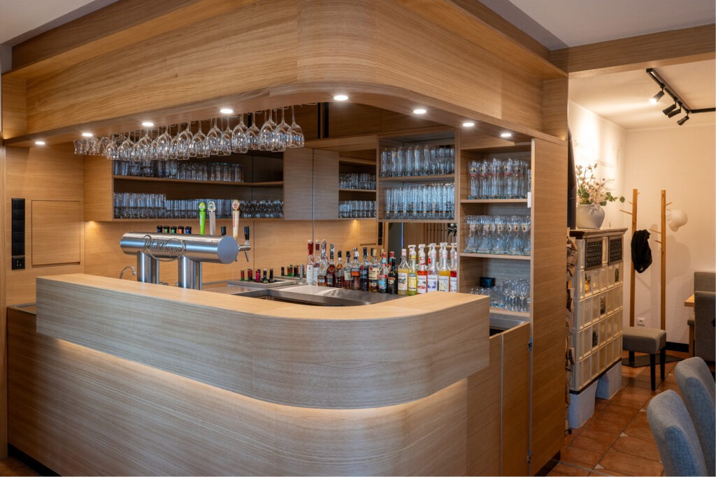Der komplette Innenausbau und die gestalterische Planung des Restaurants stammen aus der erfahrenen Hand der Tischlerei Brendel. Das Ziel war es, den traditionsreichen Charme des Hauses zu bewahren und ihn behutsam in das „Hier und Jetzt“ zu überführen. Durch den Einsatz von viel natürlichem Holz und warmen Farbtönen ist ein Ambiente entstanden, das Modernität ausstrahlt, ohne die Wurzeln des Hauses zu verleugnen.