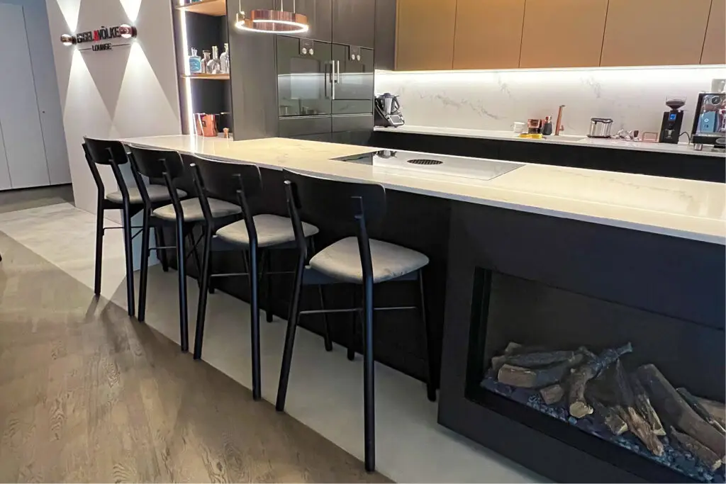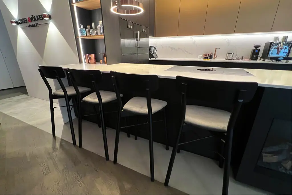 Ein Raum kann mehr als nur eine Funktion erfüllen – er kann Emotionen wecken und eine Atmosphäre schaffen, die inspiriert. Die Engel & Völkers Lounge ist genauso ein Ort. Die markante rote Polsterbank ist nicht nur ein absoluter Eyecatcher, sondern setzt auch ein starkes Statement in der modernen Innenarchitektur. In Kombination mit den eleganten schwarzen Hockern Mattis an der großzügigen Kücheninsel entsteht eine harmonische Verbindung, die zum Verweilen einlädt. Hier trifft Stil auf Gemütlichkeit. Die gelungene Balance zwischen Funktionalität und Ästhetik bietet nicht nur Raum für produktives Arbeiten, sondern auch für entspannte Gespräche und genussvolle Momente.