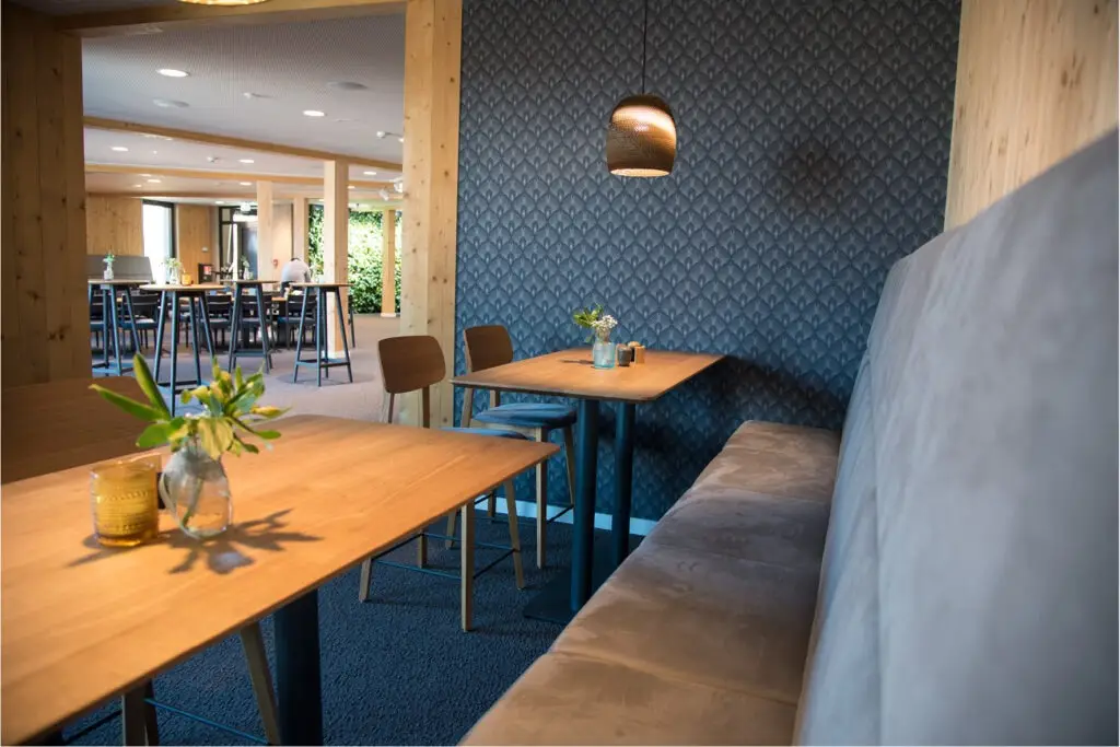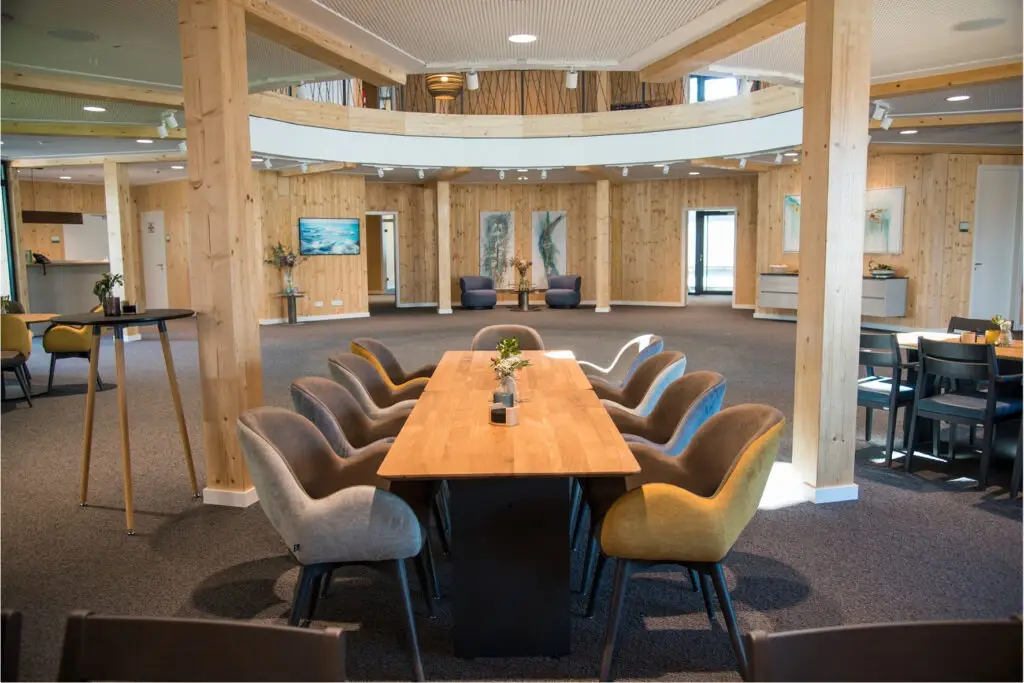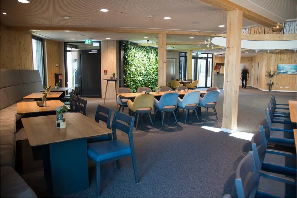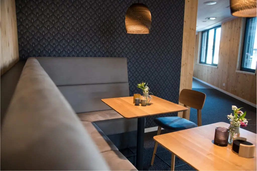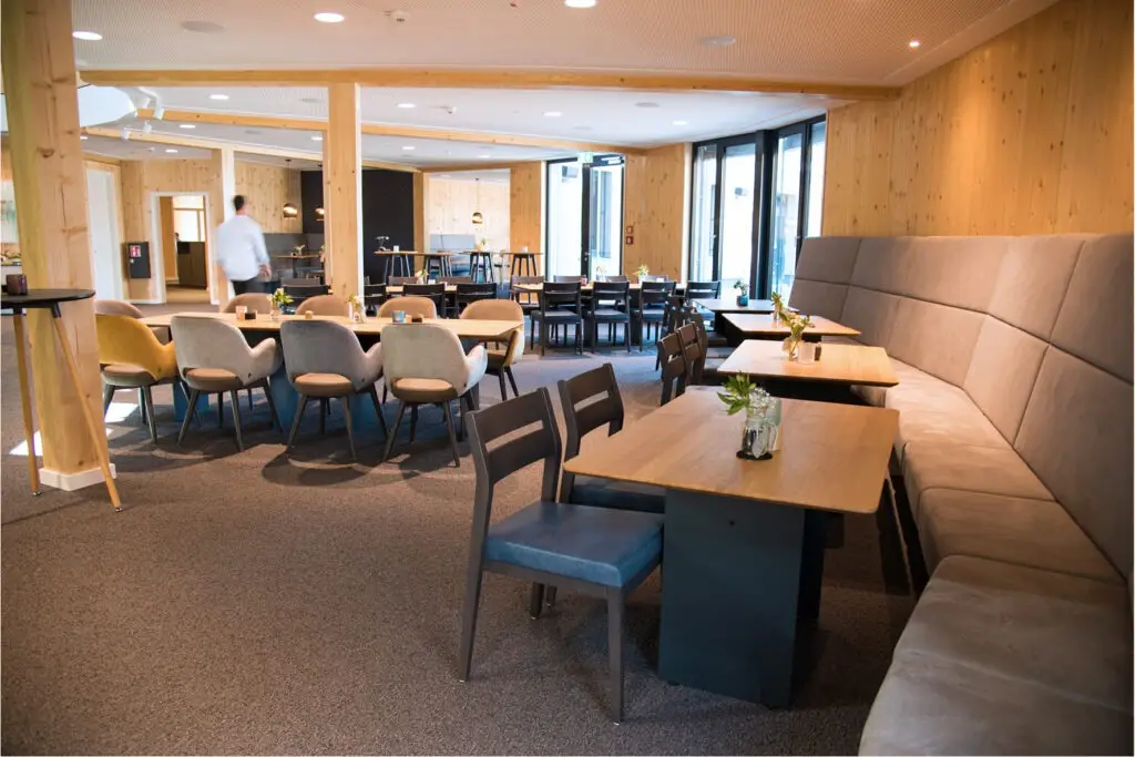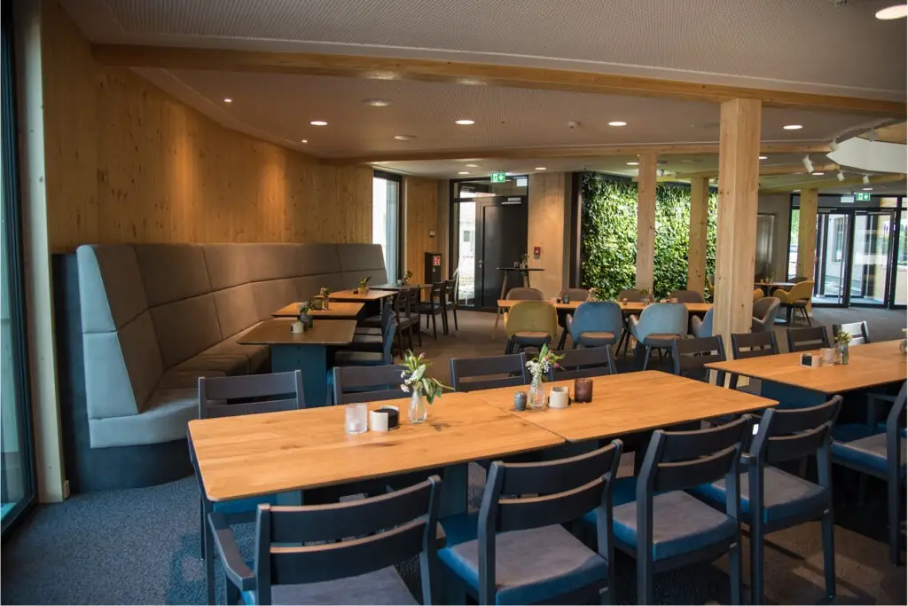 Für die Gestaltung dieses besonderen Raumes durften wir die vielfältige Möblierung liefern. Hochbänke mit den passenden Hockern „Torge“ bieten ebenso Platz wie die gemütlichen Sessel „Juna“ und die praktischen Stapelstühle „Jakob“. Ergänzt wird das Ensemble durch unsere Polsterbänke „Thea“ in zwei verschiedenen Sitzhöhen, die zum Verweilen einladen. Die abwechslungsreiche Möblierung fügt sich harmonisch in die tolle Atmosphäre ein, die von viel Holz, einer besonderen Akustik und einem angenehmen Raumklima geprägt ist. Eine beeindruckende Pflanzen-Wand rundet das Wohlfühlambiente ab.