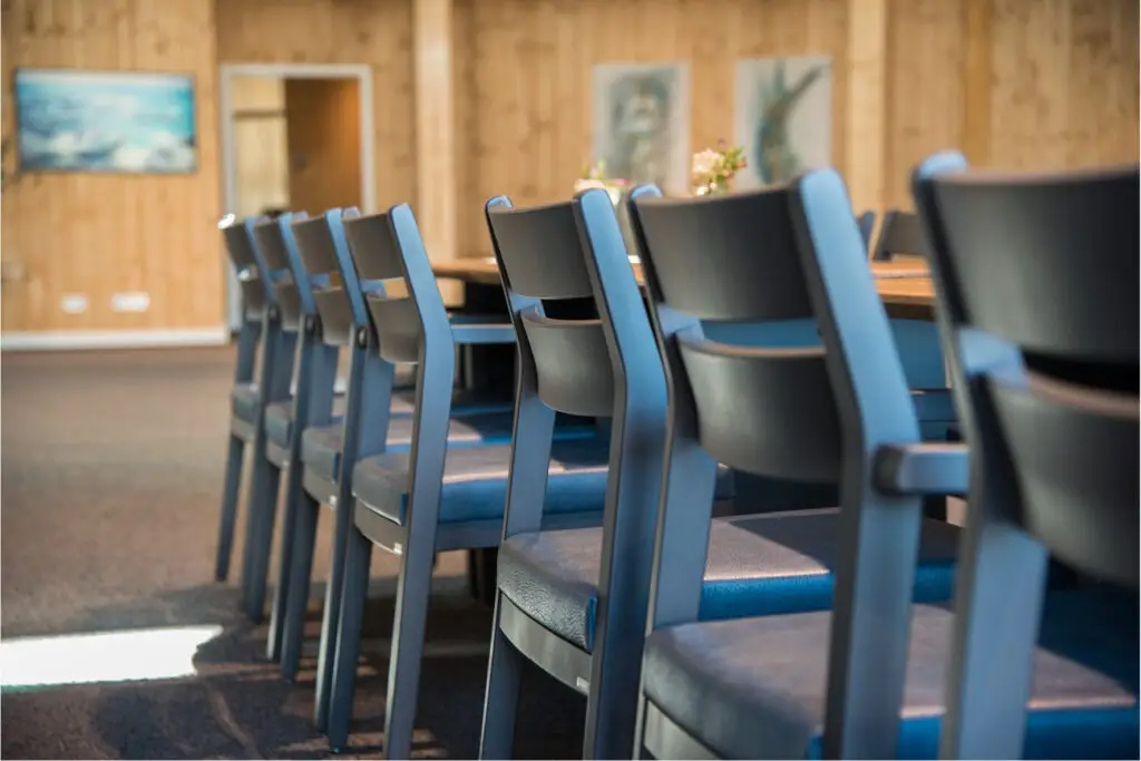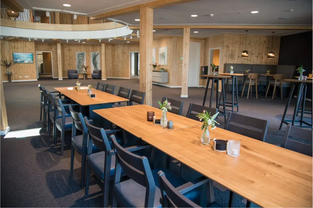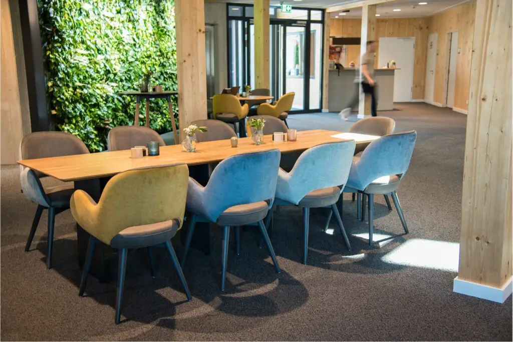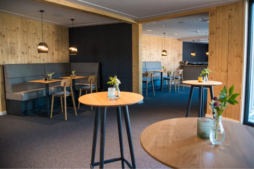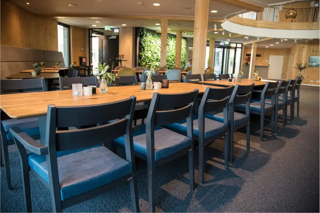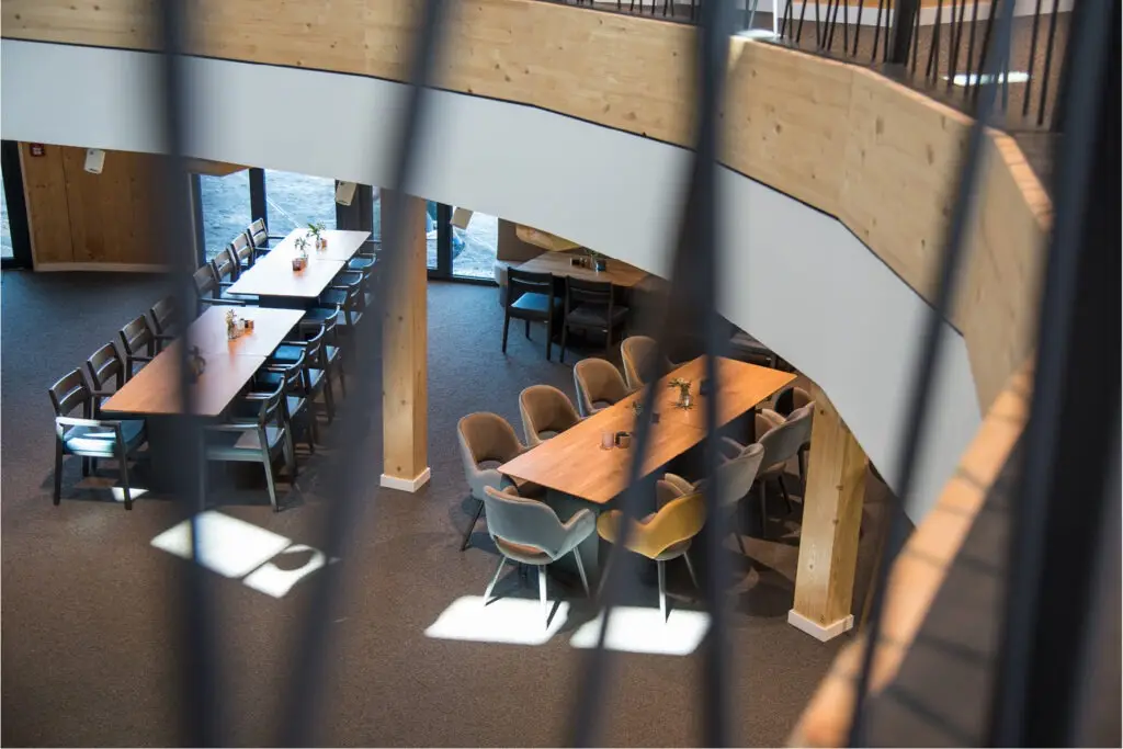 Für die Gestaltung dieses besonderen Raumes durften wir die vielfältige Möblierung liefern. Hochbänke mit den passenden Hockern „Torge“ bieten ebenso Platz wie die gemütlichen Sessel „Juna“ und die praktischen Stapelstühle „Jakob“. Ergänzt wird das Ensemble durch unsere Polsterbänke „Thea“ in zwei verschiedenen Sitzhöhen, die zum Verweilen einladen. Die abwechslungsreiche Möblierung fügt sich harmonisch in die tolle Atmosphäre ein, die von viel Holz, einer besonderen Akustik und einem angenehmen Raumklima geprägt ist. Eine beeindruckende Pflanzen-Wand rundet das Wohlfühlambiente ab.