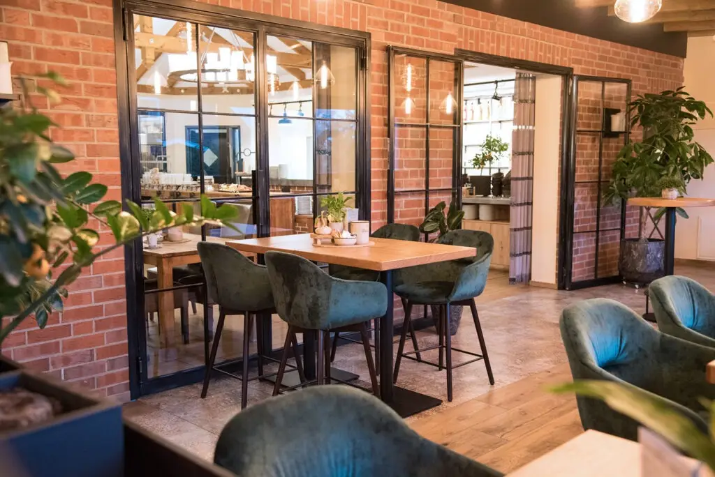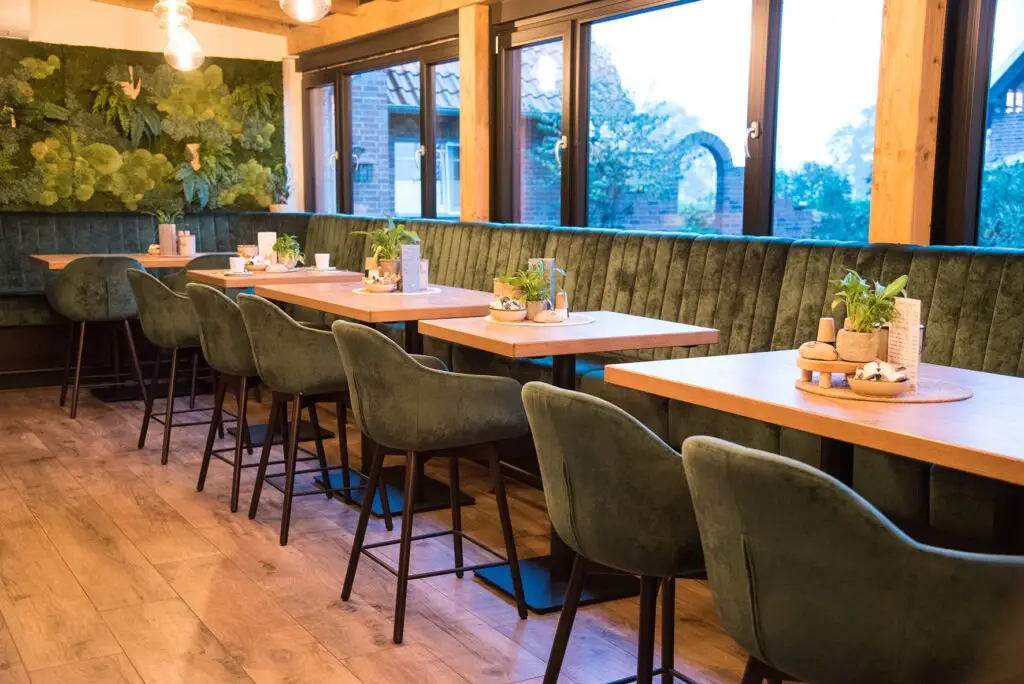 Der Wintergarten ist das Herzstück des Cafés und begeistert mit vielfältigen Sitzmöglichkeiten. Hier gibt es den bequemen Barhocker „Jonna“, der mit seiner Polsterung und Rückenlehne ein besonderes Sitzerlebnis verspricht. Durch sein abgerundetes Design eignet sich Jonna hervorragend für eine entspannte Zeit, sei es für einen kurzen Snack oder ein ausgiebiges Frühstück. Die Polsterbank „Thea“ bietet zusätzliche Gemütlichkeit und lädt zum Verweilen ein.