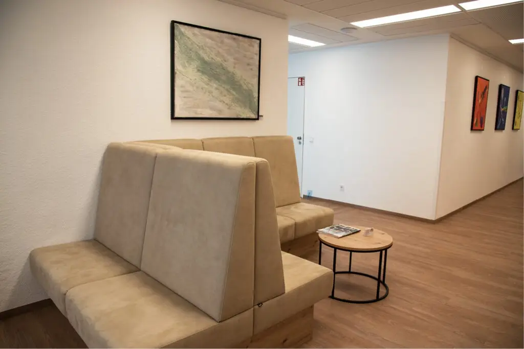 Die Sitzbank Thea mit ihrer großzügigen Höhe dient in einem anderen Wartebereich als raumteilendes Element. So entstehen private Nischen. Kombiniert ist dieser Wartebereich mit dem bequemen Sessel Marvin und dem praktischen Lounge-Tisch Nele. Hier finden Patienten ruhige Wartebereiche. Die sorgfältig ausgewählten Möbel tragen maßgeblich dazu bei, dass sich Patienten in den Wartebereichen der Radiologie Coesfeld wohl und gut aufgehoben fühlen. Dies unterstreicht das Bestreben der Praxis, neben einer professionellen medizinischen Versorgung auch eine angenehme und patientenorientierte Umgebung zu schaffen. Komfort und Zugänglichkeit werden hier großgeschrieben. Radiologie Coesfeld Osterwicker Straße 29 48653 Coesfeld