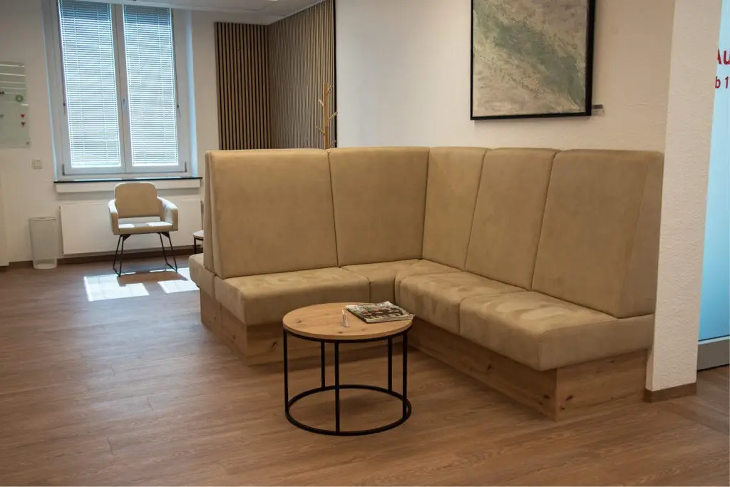 Ein weiterer Wartebereich ist mit dem komfortablen Sessel Marvin und dem einladenden Ohrensofa Paula ausgestattet. Der 2-Sitzer Paula verspricht mit seinen Ohren nicht nur Gemütlichkeit, sondern trägt auch zur Verbesserung der Raumakustik und sorgt für Privatsphäre. Die grüne Sitzbank Fredi in einer Nische setzt einen lebendigen Farbakzent und trägt zu einer angenehmen Warteatmosphäre bei.